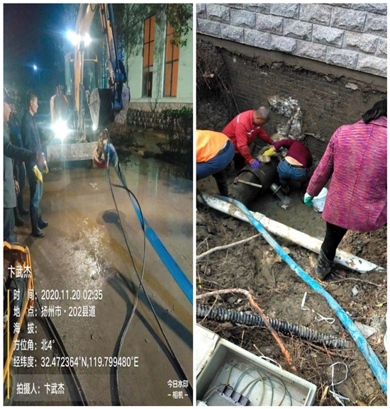 (11月20日凌晨5點(diǎn)。)由于停水后,余水不斷,且管槽較深,大約挖至1.8米,破損的管道才顯現(xiàn)出來,是口徑DN375鋼管漏水。經(jīng)過排查,維修人員(于凌晨6點(diǎn))精確到了管道上的漏水點(diǎn)。