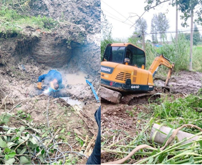 8月12日上午8時許,公司接到群眾電話稱,江都區(qū)丁伙鎮(zhèn)紅廟渠南路魚塘附近,有水管出現(xiàn)爆漏。龍泉公司項目部夏陽華經(jīng)理帶領搶修人員立即到達現(xiàn)場核查,經(jīng)查明是DN500鋼管老化裂出口子。事故點在小路半坡大樹下,靠近魚塘且土質松軟濕滑,機械施工難度較大,修復時間也較長。歷經(jīng)9個小時才將漏點修復。