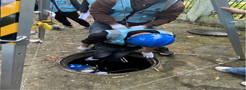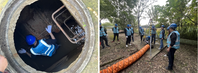 隨著演練正式開始,演練人員在閥門井口發(fā)現(xiàn)有人違規(guī)操作,入井倒地。指揮組接到匯報,命令啟動有限空間應(yīng)急搶修預(yù)案,并趕往現(xiàn)場。同時保障組攜帶鼓風(fēng)機(jī)、安全繩、呼吸器等安全設(shè)施進(jìn)入現(xiàn)場。站長到達(dá)閥門井后,使用空氣監(jiān)測儀,并不間斷匯報檢測數(shù)據(jù)。搶修組進(jìn)入現(xiàn)場后,穿戴防護(hù)用具。
