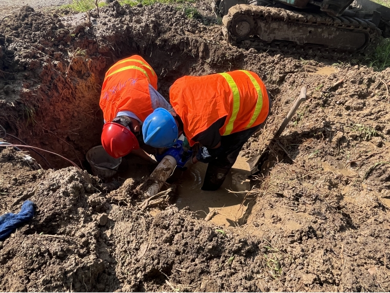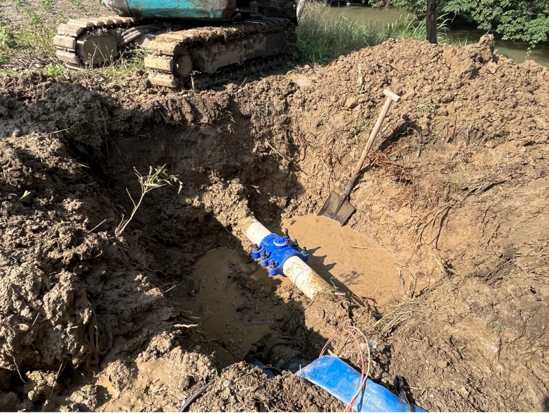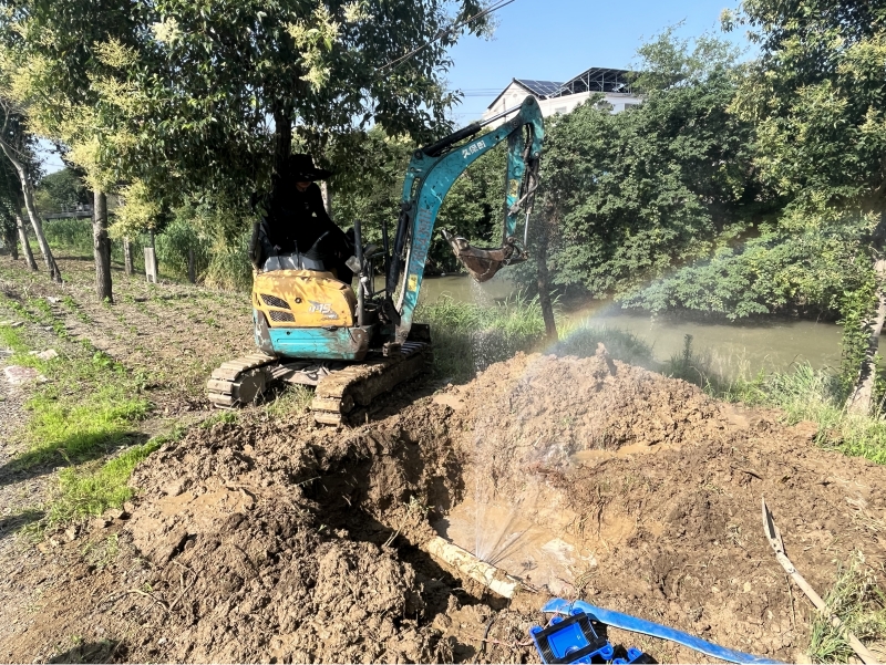 演練現(xiàn)場,此次搶修管道為DN110PVC管道,首先由維修人員關(guān)閉搶修點(diǎn)上下游閥門,在專人現(xiàn)場指揮下,機(jī)械挖掘組進(jìn)行漏點(diǎn)挖掘。挖掘機(jī)設(shè)備運(yùn)行良好,很快就將漏點(diǎn)挖出。漏點(diǎn)挖出后,使用水泵將坑中余水抽干。